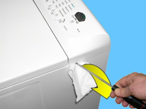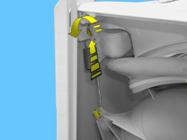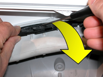 Inserire un cacciavite nelle asole laterali come indicato in figura, prima da un lato e poi dall'altro, avendo sempre cura di inserire una protezione tra il mobile e il cacciavite per evitare di graffiare la vernice.